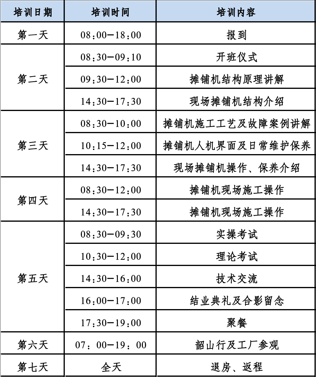摊铺机客户培训,线下培训6天,费用3180元/人